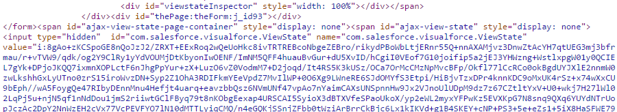 Since HTTP is a stateless protocol, any web application that needs to maintain state between page requests has to deal with how to handle View State. Visualforce handles it by using a hidden form element. Data in components and controllers are stored in an encrypted and hidden field on your page (see image below) that must be serialized and deserialized every time the Visualforce page is requested. Large view state sizes can quickly cause pages to suffer performance problems. Additionally, the Force.com platform limits your pages to a maximum view state size of 135Kb.