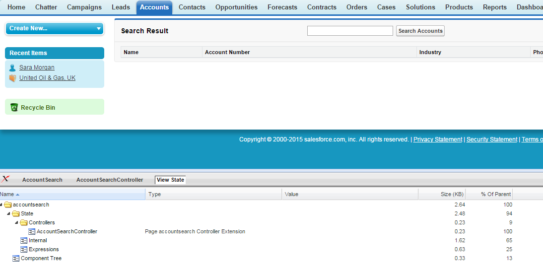The initial view state (which means that no search has been executed yet) for this particular page is very low – only 2.64KB, which is far below the 135KB threshold allowed. But, what if this page had several more apex components, or what if I executed a search returned hundreds or thousands of records? Well, that number could go up rather quickly and this is why you need to be aware of what your pages view state is and to test it against large quantities of data.