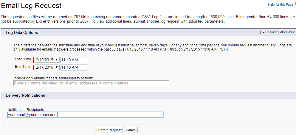 You will have to specify a start and end time and the period can be no longer than 7 days. Doing so will generate a CSV file that tells you information such as the email address of each sender and recipient, along with the date and time and any error codes encountered.