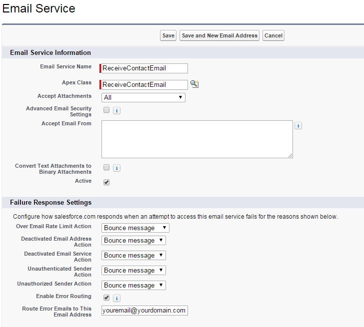 Once you have the code for your email handler, you will need to define the Email Service in your Salesforce Setup. You do this by going to Setup | Develop | Email Services and clicking New Email Service.